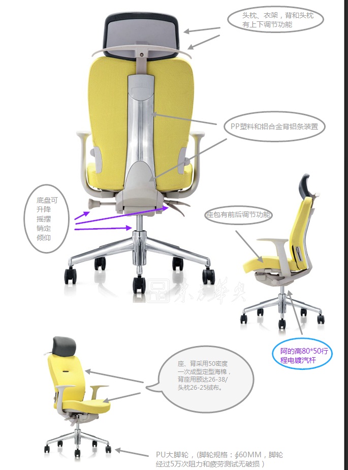 管和底盤,底盤有升降、搖擺、銷定、傾仰,座包有前后調節功能。座、背采用50